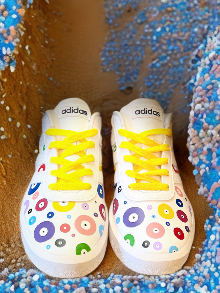 Σε αυτά τα πολύχρωμα & παιχνιδιάρικα παπούτσια θα δεις μία άλλη οπτική στα μάτια βασκανίας! Η κοπέλα μου ζήτησε πολύχρωμα ματάκια, οπότε βγήκαν ακόμα πιο χαρούμενα τα παπούτσια με τα κίτρινα κορδόνια που έβαλα.